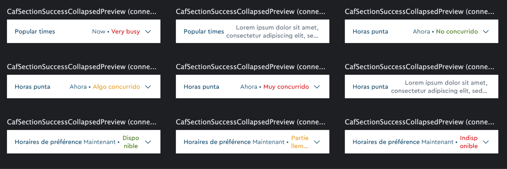 Early designs used text labels like “Usually Available.” When tested with translations (e.g. German), labels broke layouts. The character count increased and the design did not prove to be scalable because of spacing and readability issues.