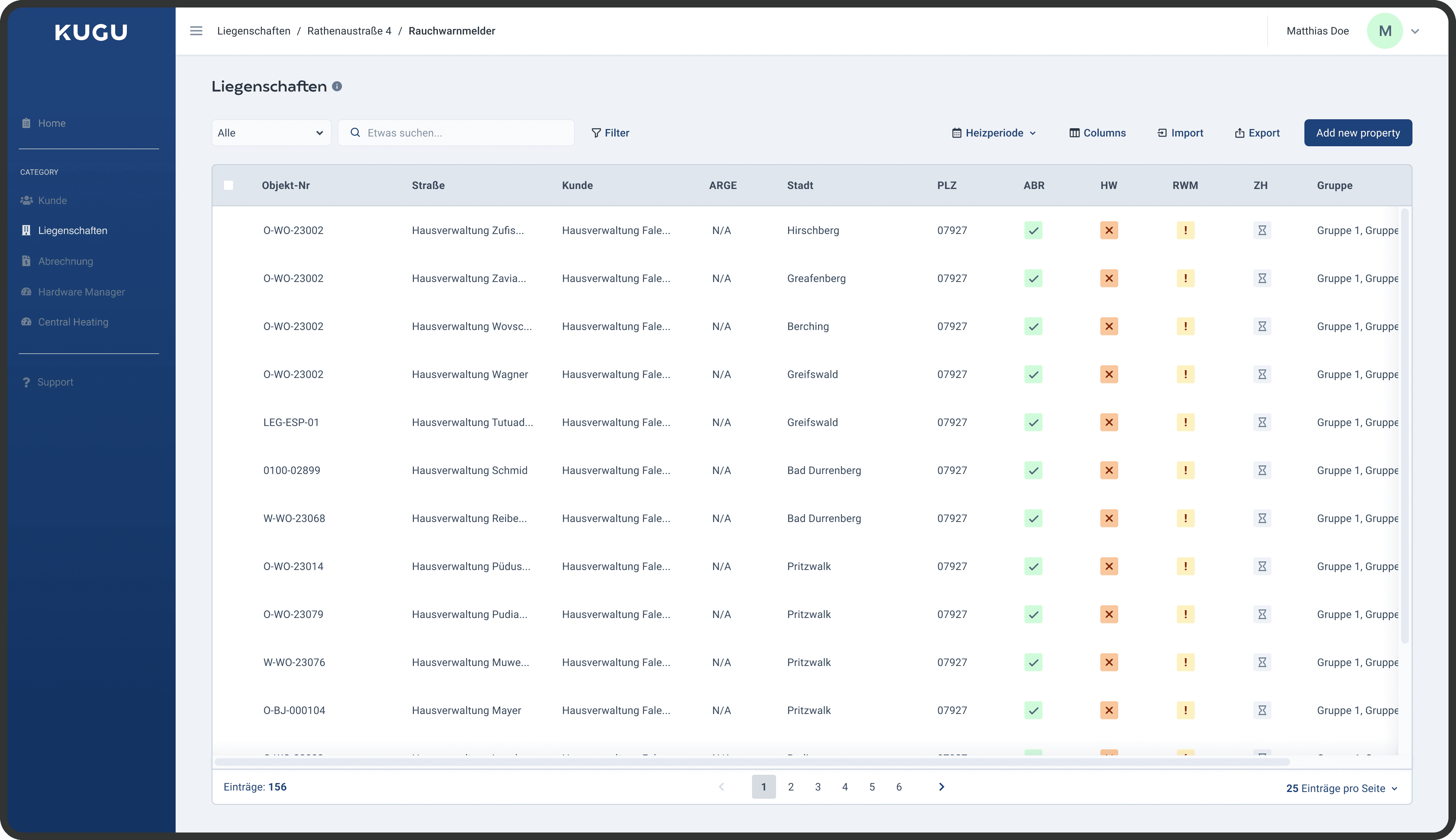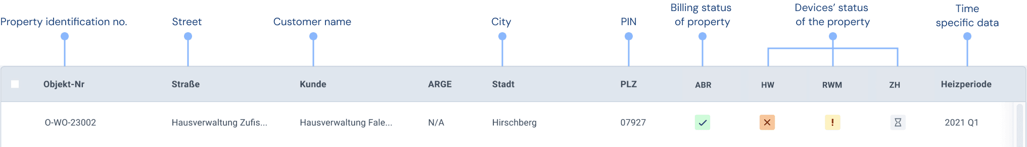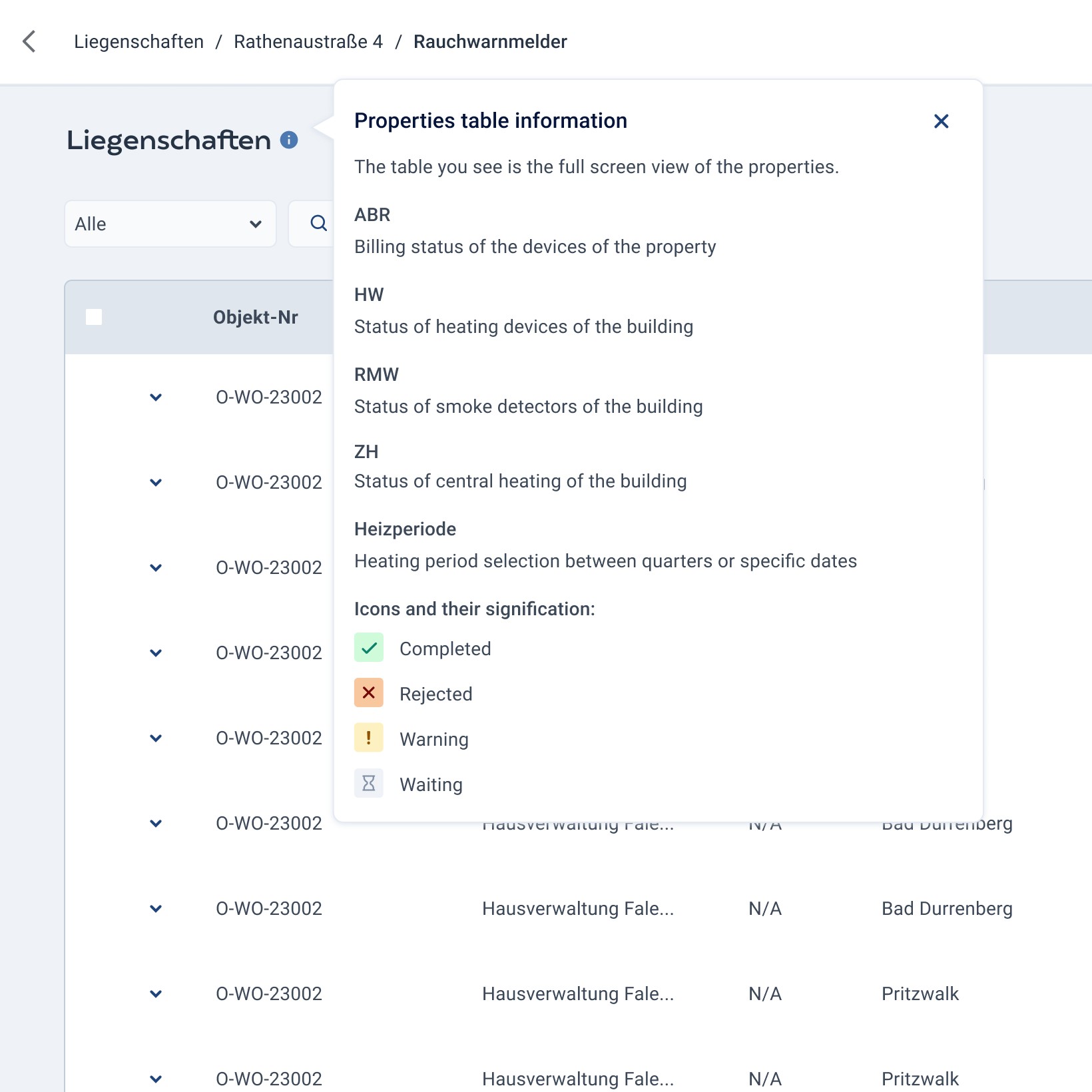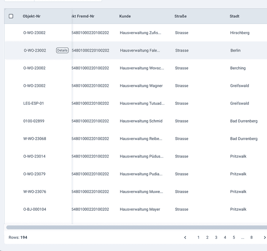 Objekt Nummer is important while referencing building numbers. Each row contains a building that, when clicked, leads to a property detail page that describes the nitty-gritty of the building to prepare for billing.