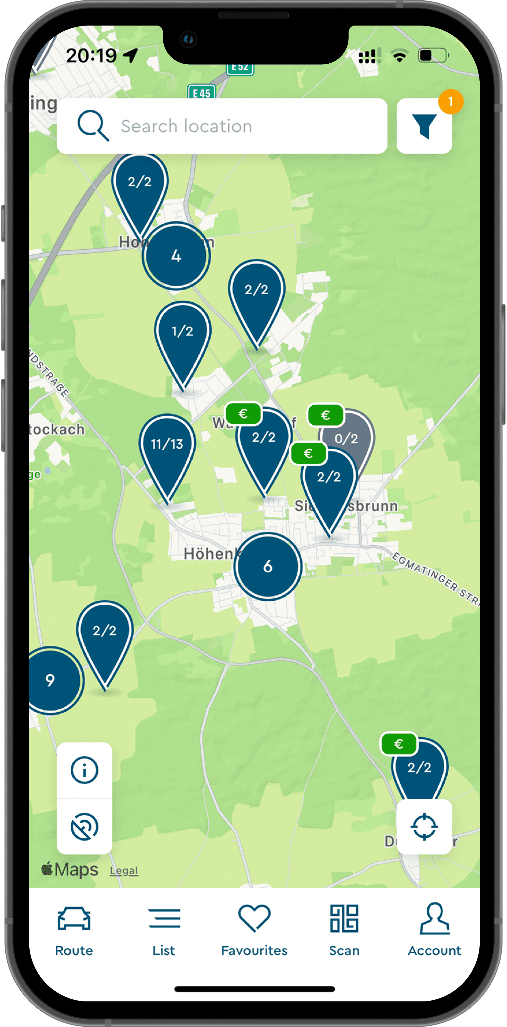 Users can see pricing cues directly on the map as colored currency icons, helping them identify cheaper chargers before tapping into details.